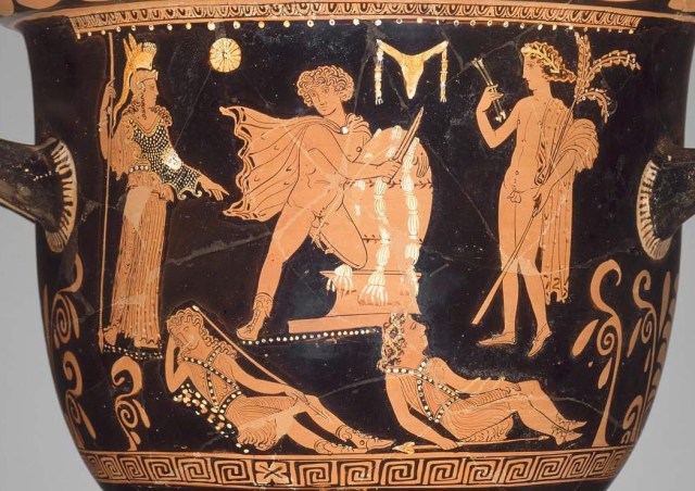 Oreste la Delphi, între Atena și Apolo, cu eriniile dormind