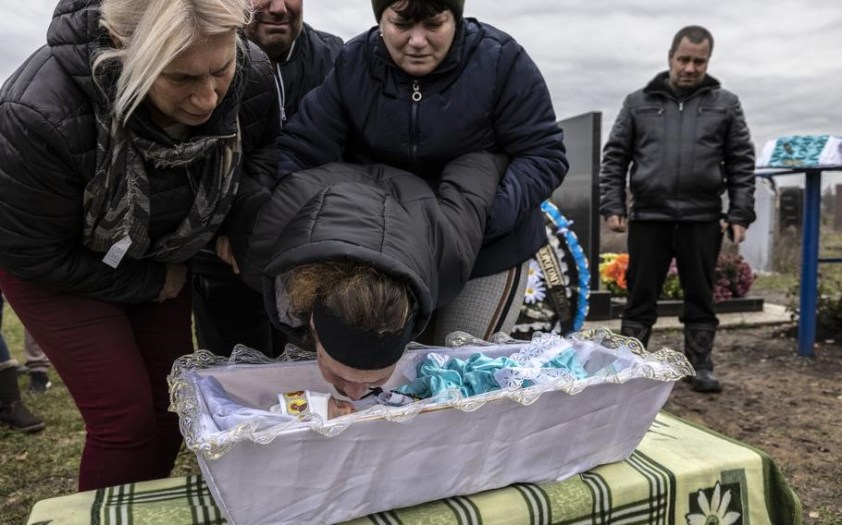 24 noiembrie 2022: Maria Kamianetska sărută fața bebelușului ei, în timp ce mama ei, Tetiana Svystunova, și sora ei Lyuba o țin în brațe. Băiatul a fost ucis la mai puțin de 48 de ore de la naștere, într-un atac cu rachete rusești care a devastat maternitatea unui spital din regiunea Zaporizhzhia. (Heidi Levine/pentru The Washington Post)