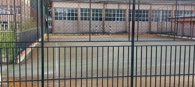 Covorul sintetic care acoperă terenul este terminat (fiind distrus iremediabil)! Așa cum se poate vedea (după dârele din centrul fotografiilor de mai jos), în acest spațiu erau „antrenate” mașinile unora dintre cei care aveau acces în incinta fostului liceu. Sau erau descărcate din tiruri produsele expediate de UE pentru populația pauperă a orașului. Care erau distribuite din Sala de sport, până când au reușit să o inunde, făcând-o impracticabilă! Și s-au mutat în școală, deși primăria deține un spațiu având această destinație, aflat chiar în vecinătatea imobilului fostului liceu.