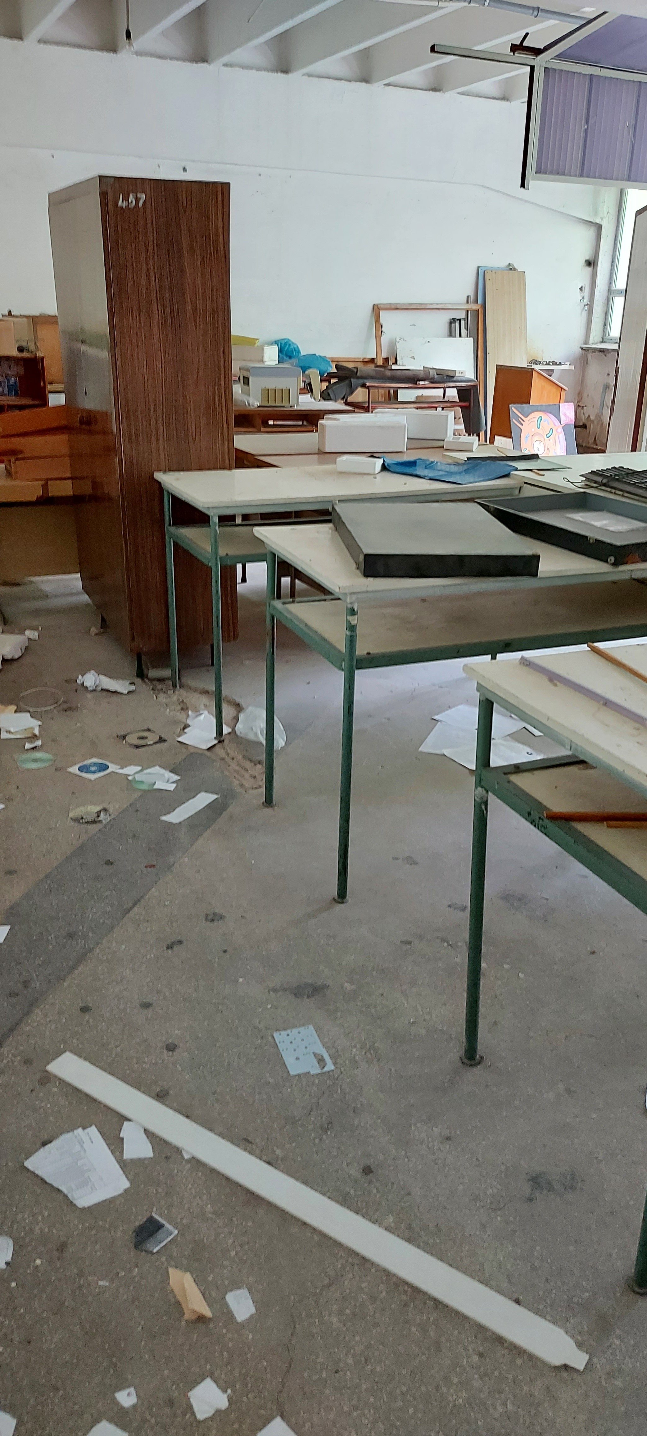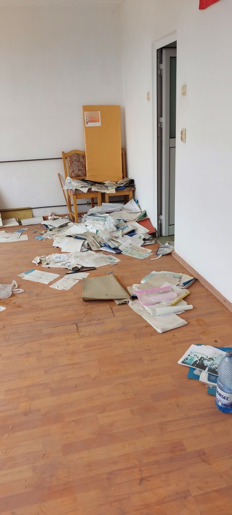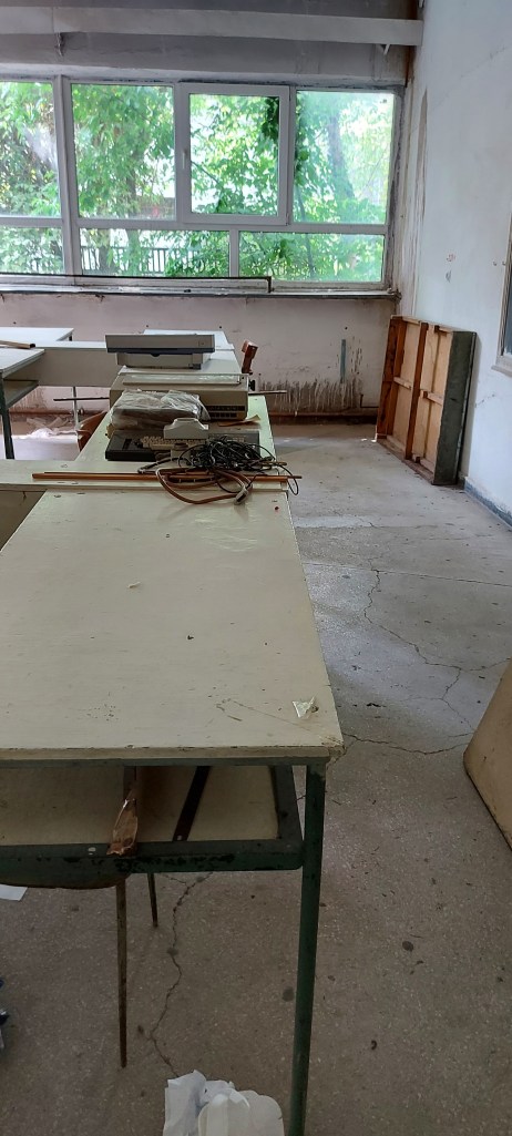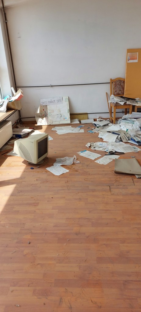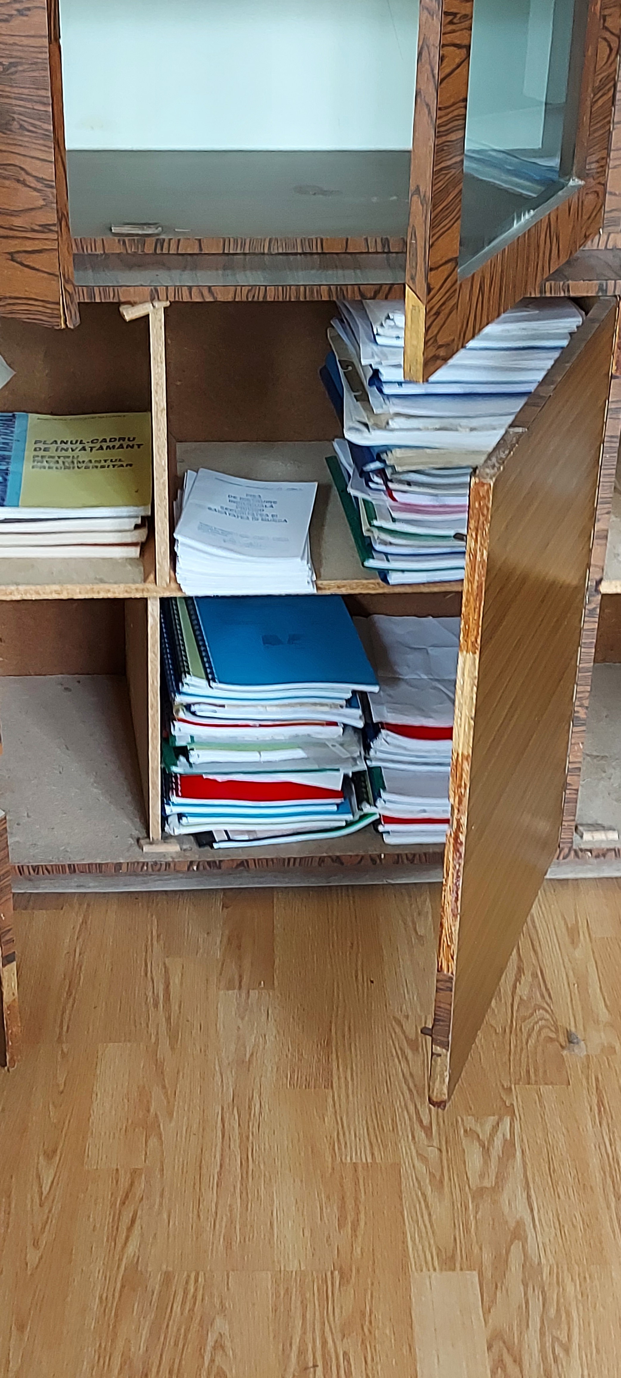 Alte spații școlare de la parterul clădirii (cu acces de pe scara a doua, la stânga din holul Bibliotecii) Și aici au fost „împrumutate” caloriferele, fiind duse spre zări mai… productive! În rest, au fost depozitate diferite materiale, care nu prezentau interes pentru… prădători. În ultima dintre fotografii – rezemate de un perete – sunt câteva din hărțile evacuate din Cabinetul de istorie!